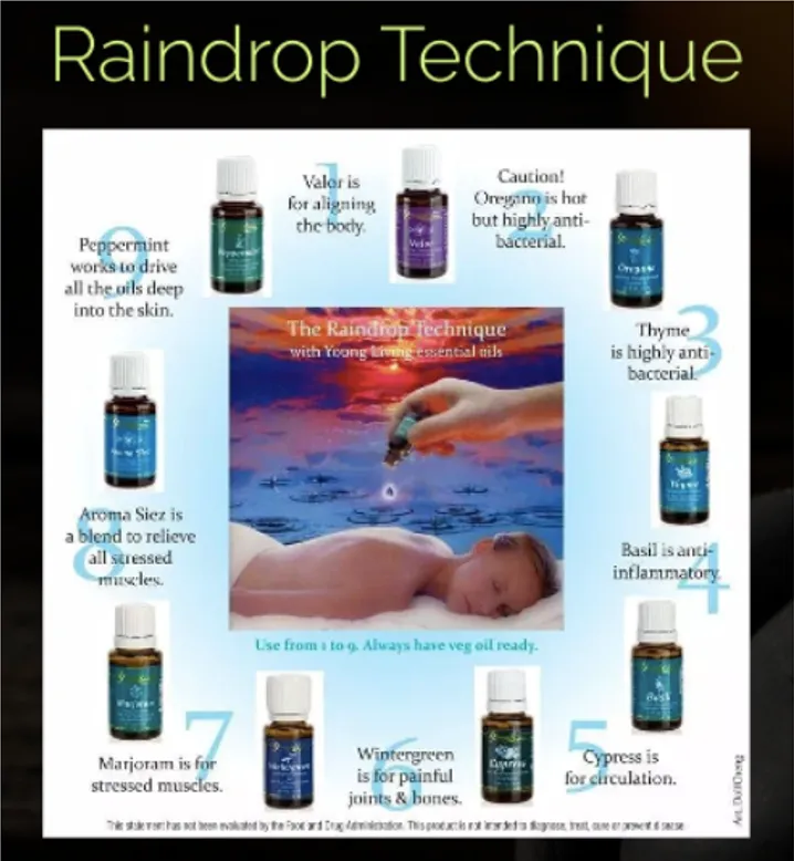 Raindrop Technique is a far superior experience than a regular message. It combines essential oils with specific techniques to induce the parasympathetic state of healing. It's non-invasive relaxing approach makes it an invaluable method to promote healing for the body inside and out. Developed by D. Gary Young during an amazing visit with the Lakota Indians who were known to migrate across the Canadian border to bask in the northern lights for healing purposes. Many experience dramatic healing during these experiences but when the U.S Canada border was restricted. development of the raindrop technique replaced the ritual. Raindrop technique has been embraces by massage therapists. chiropractors. and other medical professionals for its immense support for full body relaxation correcting spinal misalignments and antiviral effects. Using vitaflex technique on the feet and Feathering Technique along the spine. the raindrop technique will whisk you away from the daily stresses of life for a session of healing and bliss. For further research. statistical validation in 2011 by David Stewart PhD in his booklet Statistical Validation of Raindrop Technique available at www.DiscoverLSP.com