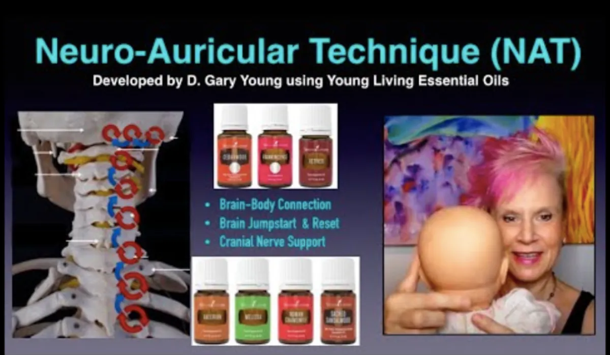 The "Neuro-Auricular Technique (NATI was originated by D. Gary Young. The purpose of NAT is to jump-start and reconnect all of the synapses of the brain and upper spine. particularly in the locus ceruleus and vagal ganglia. The locus ceruleus is the central switching station of the body comprised of more than 1000 nerves at the base of the brain. Every nerve impulse controlling our voluntary muscles as well as our organs passes through this master control station. A principal purpose of NAT is to make sure this vital nerve junction is fully functioning along with the rest of the brain. The purpose of NAT is to fully awaken and restore full capacity to the locus ceruleus and vagal ganglion at the base of the brain and to connect all of the synapses of the brain and upper spinal cord, thus creating an environment that facilitates optimal health. healing, and bodily function. NAT can also be used for emotional release by using oils such as RutaVaLa and others.
